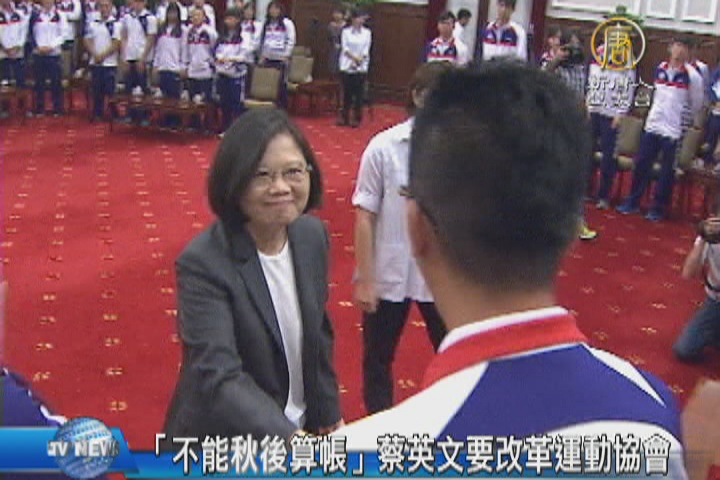 【新唐人亞太台 2016 年 08 月 29 日訊】今年奧運,台灣運動協會的問題浮上台面。總統蔡英文今天(29)接見奧運代表時,提出改革運動協會,要在公開透明、專業原則下,建立教練與選手的遴 選制度。並設立外部仲裁協會,保障選手權益,絕對不能出現秋後算帳。而之前發生球鞋事件的羽球選手戴資穎,則是缺席,沒有出現在總統接見的場合。