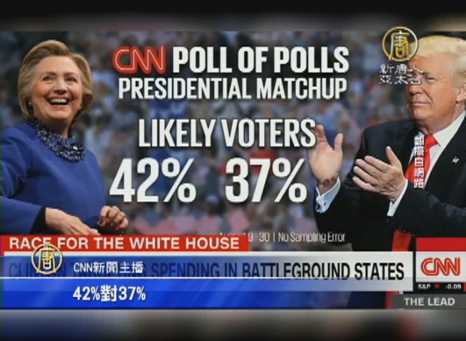 CNN新聞主播:「最新的CNN民調,根據5項最新的全國民調,顯示希拉蕊領先川普,42%對37%。」