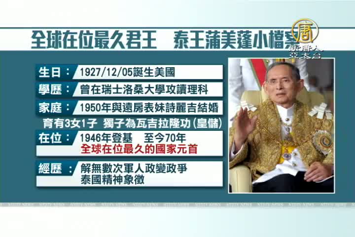 【新唐人亞太台 2016 年 10 月 14 日訊】全球在位最久的國家元首,高齡八十八歲的泰皇蒲美蓬昨天病重辭世。泰國總理府也公告泰國進入國喪,期間所有公務員將穿黑服服孝,所有娛樂場所也將關門30天。泰王蒲美蓬1927年出生美國,曾在瑞士洛桑大學就讀,結婚後育有3女1子,獨子是目前的王儲,瓦吉拉隆功。而泰皇在位70年,調解過無數次軍人政變政爭、是泰國精神象徵。在前一天蒲美蓬傳出病危後,泰國軍政府領導人帕拉育 便取消預定行程,趕回曼谷 會見王儲 。昨天,泰國股市一度大跌達6.8%,泰銖匯率也大貶1.1%。