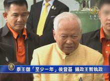 2016-10-17 12:45:44泰國總理帕拉育週六晚些時候表示,泰王蒲美蓬逝世後,樞密院主席將擔任攝政王,直到王儲繼位,王儲已經提出,暫緩登基「至少一年」。