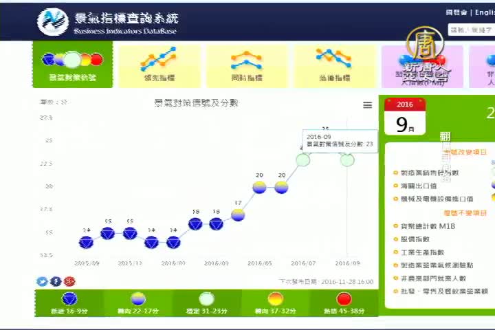 【新唐人亞太台 2016 年 10 月 28 日訊】歡迎回來。國發會昨天發布9月景氣燈號,在相關指標表現穩健下,連續3個月亮出 代表景氣穩定的綠燈,綜合判斷分數雖然比上個月減少2分,為23分,顯示國內景氣正持續回溫;但也有民眾認為,最近菜價居高不下,支出壓力與生活壓力似乎更重。