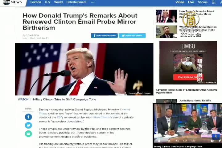 【新唐人亞太台 2016 年 11 月 02 日訊】早安新唐人,先帶您關心美國總統大選,美國華盛頓郵報-美國ABC新聞,1日公布最新民調結果,顯示,川普小贏希拉蕊1個百分點,這是他從5月以來首度超前。而且川普在支持者熱情與投票意願上都大贏希拉蕊,似乎顯示電郵門事件,已經對希拉蕊選情造成衝擊。不過,消息也讓華爾街股市,今天收盤下跌。