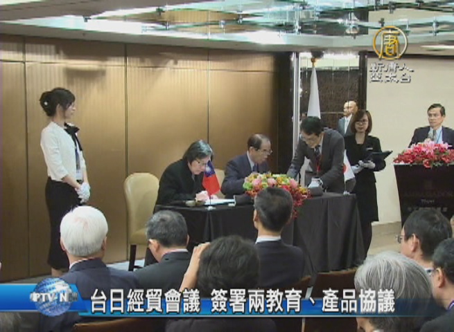 【新唐人亞太台 2016 年 11 月 30 日訊】為期兩天的台日經貿會議,今天(30)結束,雙方簽署教育交流與產品安全交流備忘錄。亞東關係協會會長邱義仁,與日本交流協會會長大橋光夫,共同簽署協議。雖然沒有觸及核災食品開放,但前一天日方公開喊話希望解禁日本食品輸台,國民黨也動員2、30人,在飯店外抗議。