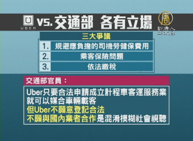 【新唐人亞太台 2016 年 12 月 06 日訊】歡迎回來,針對Uber違法派遣小客車載客,衝擊計程車司機生計,立法院交通委員會周三排定修正相關法案,可能針對Uber違法載客,開罰最高2500萬元,今天Uber高層再度來台,呼籲政府解決爭議。