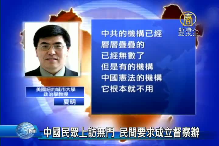 美國紐約城市大學政治學教授夏明:「冤民、訪民等等,他們提出要中央來成立一個特別調查委員會或特別的監督機構,我覺得願望是好的。但是它的問題就在於,中共的機構已經層層疊疊的已經無數了,但是有的機構,中國憲法的機構,它根本就不用。」