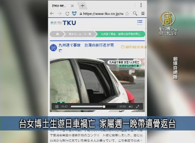【新唐人亞太台 2017 年 02 月 13 日訊】台女博士生遊日車禍亡 家屬週一晚帶遺骨返台
