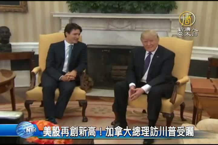 【新唐人亞太台 2017 年 02 月 14 日訊】再來看到,美國股市週一開盤,三大指數再創新高,標普500市值,更是史上第一次突破20兆美元。其中,金融和工業部門,受益於川普利多政策,表現最亮眼。另外,加拿大總理杜魯道 訪美會見川普,希望促進兩國經貿關係。尤其是,川普之前喊出,要和加拿大與墨西哥,重談北美自由貿易協定,更讓兩人的會談受關注。另外,這次川普的長女伊凡卡,也與兩人一起參加,一場女性勞動力會談,彼此交換意見。