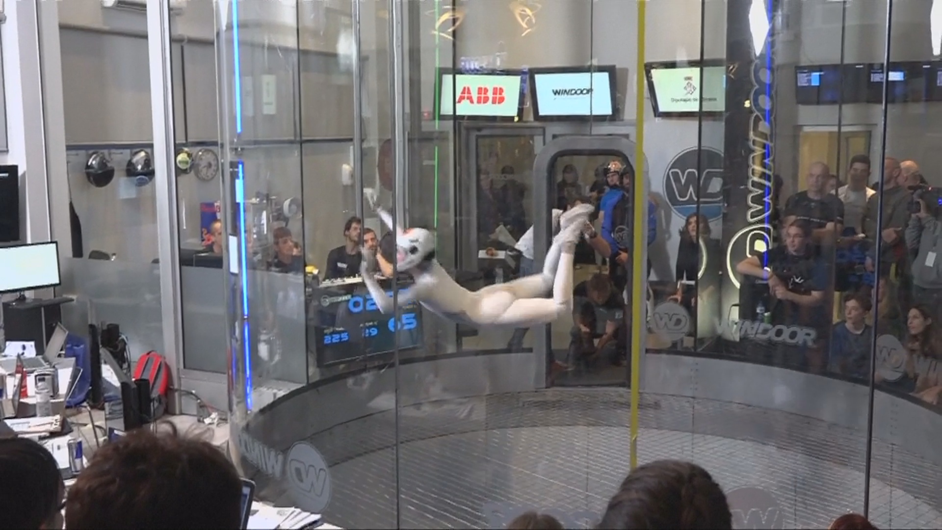這裡是室內跳傘比賽現場,不過室內要怎麼跳傘呢?它需要在氣流時速高達195公里的垂直風洞(vertical wind tunnel)中進行。高強度的氣流可以確保選手們在風洞內懸空漂浮,做出旋轉翻滾等動作,猶如真實的高空跳傘一般。是最近興起的一項運動。