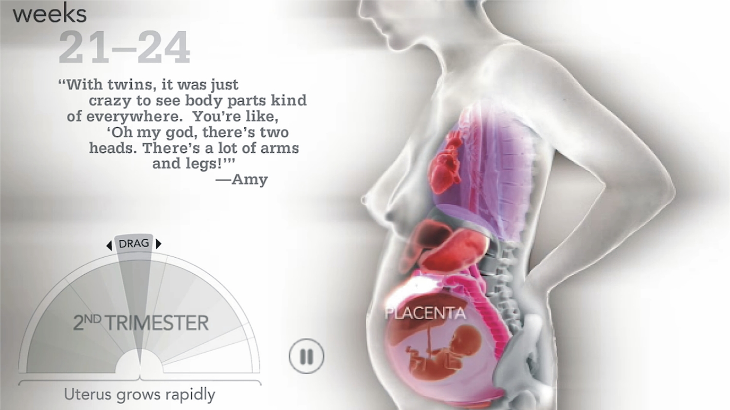 芝加哥科技博物館(Museum of Science and Industry)發布的這個視頻,名為〝你為寶寶騰出空間體驗〞(Make Room for Baby from YOU!The Experience),視頻可見,在媽媽肚子裡,改變的不只是胎兒。隨著懷孕時間的增加,子宮開始慢慢變大,腸子及胃受到擠壓,乳房也開始變大。箇中滋味不親身體驗恐怕難以知曉。