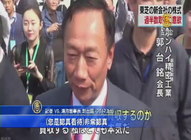 記者 VS.鴻海董事長 郭台銘 (2017.3.1):「(您會有意買東芝記憶體部門嗎?)是,我很認真,(您是認真看待?)非常認真。」