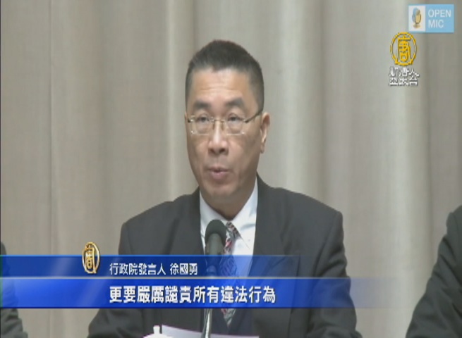 行政院發言人 徐國勇:「對值勤受傷的警察同仁表達慰問之外,更要嚴厲譴責所有違法行為,請警政署從嚴從速依法究辦,絕對不容國家法律公權力受到挑戰。」