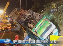 2017-02-15 08:19:13再來關心,國道5號發生遊覽車重大意外,奪走33條人命,交通部昨天勒令,承辦旅行社,蝶戀花,無限期停業。並以情節重大,撤銷遊覽車公司,友力通運,的營業執照。另外,罹難司機被傳工作16到18個小時,律師柯劭臻在臉書上說,對照其他國家勞動法規,歐盟則規定,司機出車結束後,必須休息滿11小時,才可以再出車上路。相較之下台灣的相關法規明顯有漏洞。