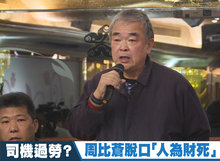 2017-02-17 20:14:09今天的前線大直擊,蝶戀花實際負責人周比蒼,首度對外公開道歉,出示司機班表,強調有讓司機休息,但針對過年期間連上2個星期,明顯過勞,周比蒼卻回應,過年有給雙倍薪,還脫口說出「人為財死鳥為食亡」,這樣的說法,讓在場的罹難司機家屬,根本是,不能接受