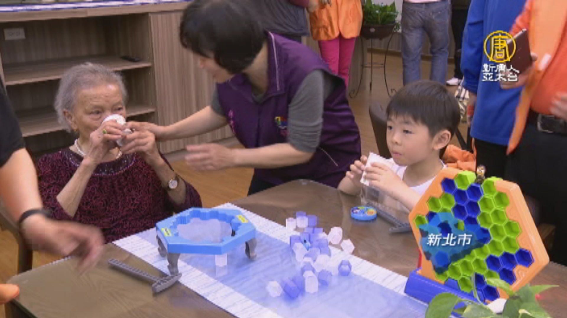 新北市政府從2014年開始,首創托老托育共融服務,這家位在三峽的中心,是第5家,平常老人小孩分開上課,一週會安排一天共融時間,讓長輩跟小朋友一起玩遊戲。