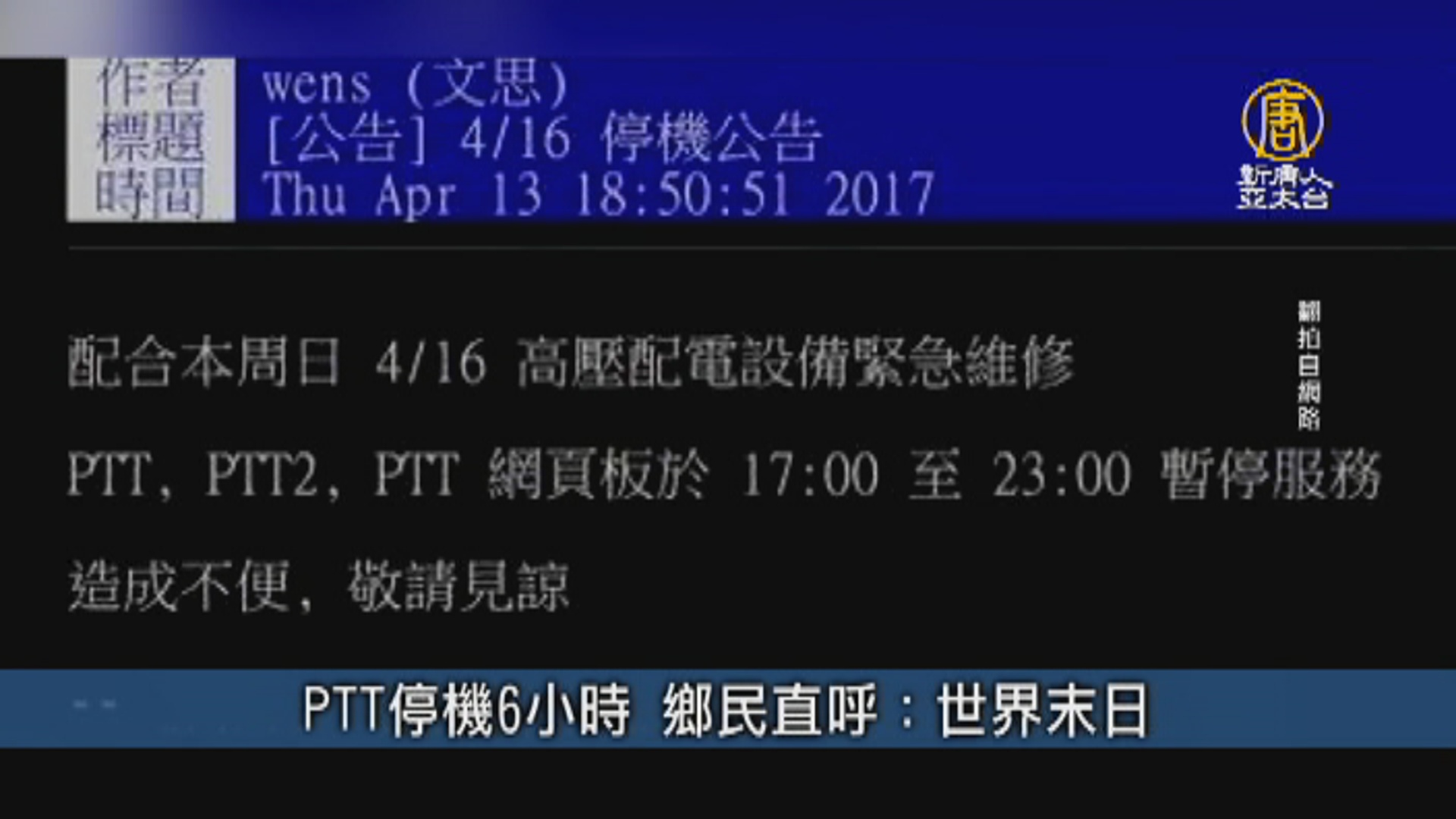 台灣網路社交論壇 PTT,每個小時都有數萬人在站上交流意見,週日下午5點開始,因為高壓配電設備維修,要停機到晚間11點。相關公告發布後,許多鄉民集體崩潰,直呼:「世界末日要來啦!」、「人生沒有希望了。」
