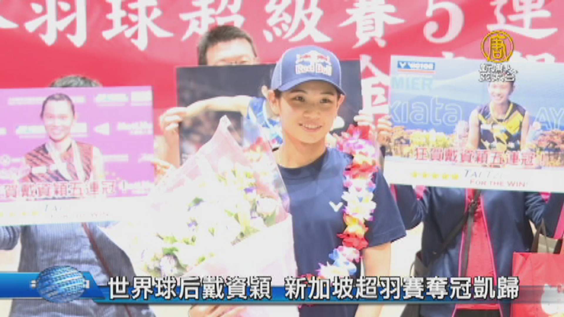 【新唐人亞太台 2017 年 04 月 17 日訊】再來看到,世界羽球球后戴資穎,昨天(16日)拿下新加坡超羽賽金盃,締造跨季5連冠、17連勝的傲人紀錄,今天下午,回到台灣,開心的在機場,接受同事們大大的擁抱及獻花。