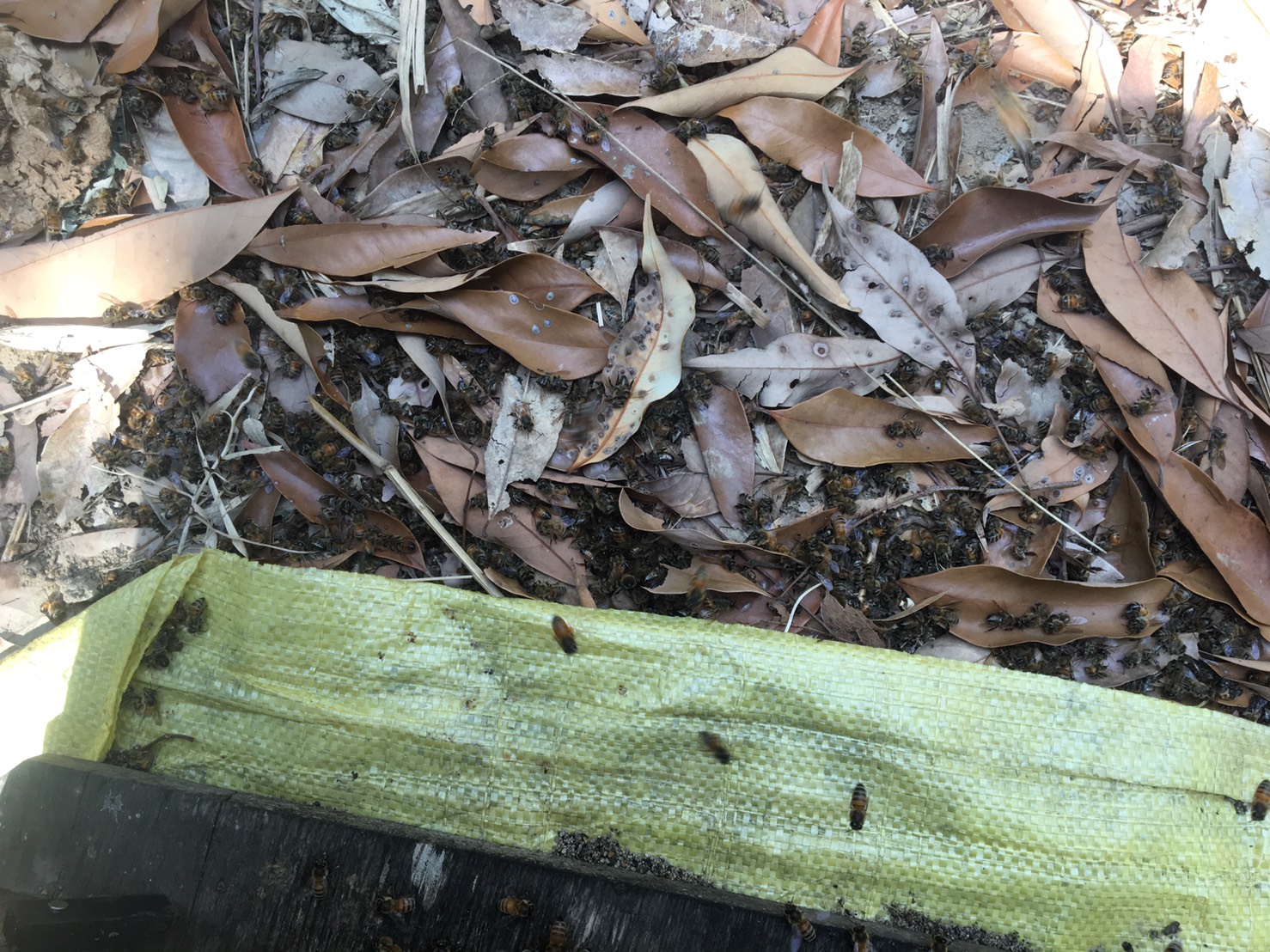 蜂群中毒,陳屍布袋及落葉上。(圖/台灣養蜂協會提供)