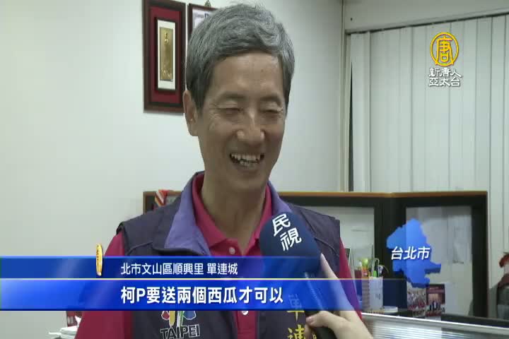 北市文山區順興里 單連城:「拿人手短吃人口軟,我們台北市里長,我們市長沒有送我們任何東西,市長沒東西,我半開玩笑說,柯P要送兩個西瓜才可以。」