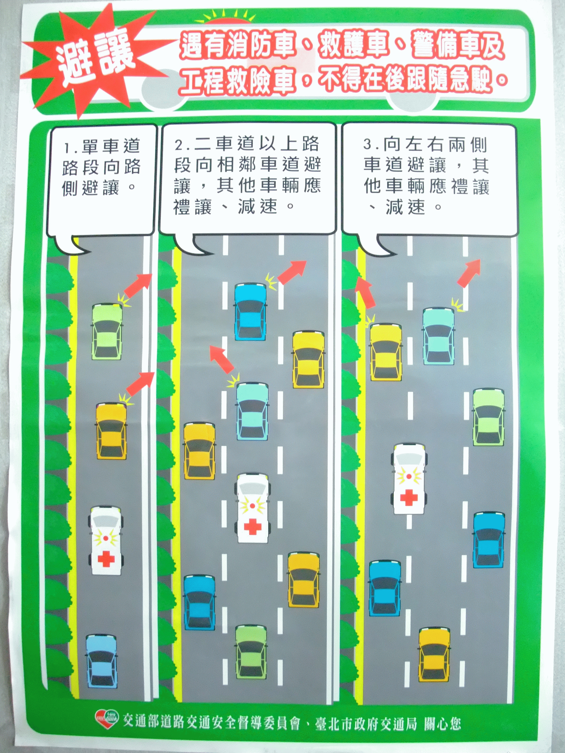 然而救災、救護車輛車禍事故時有所聞,如南部某縣市於五月中即連續4天發生救護車車禍事故,因此台中市消防局特別呼籲民眾將心比心,禮讓救災、救護車輛優先通行,遵循單車道向路側避讓、兩車道以上向相鄰車道避難的減速禮讓原則,便於消防單位及早到場救援。