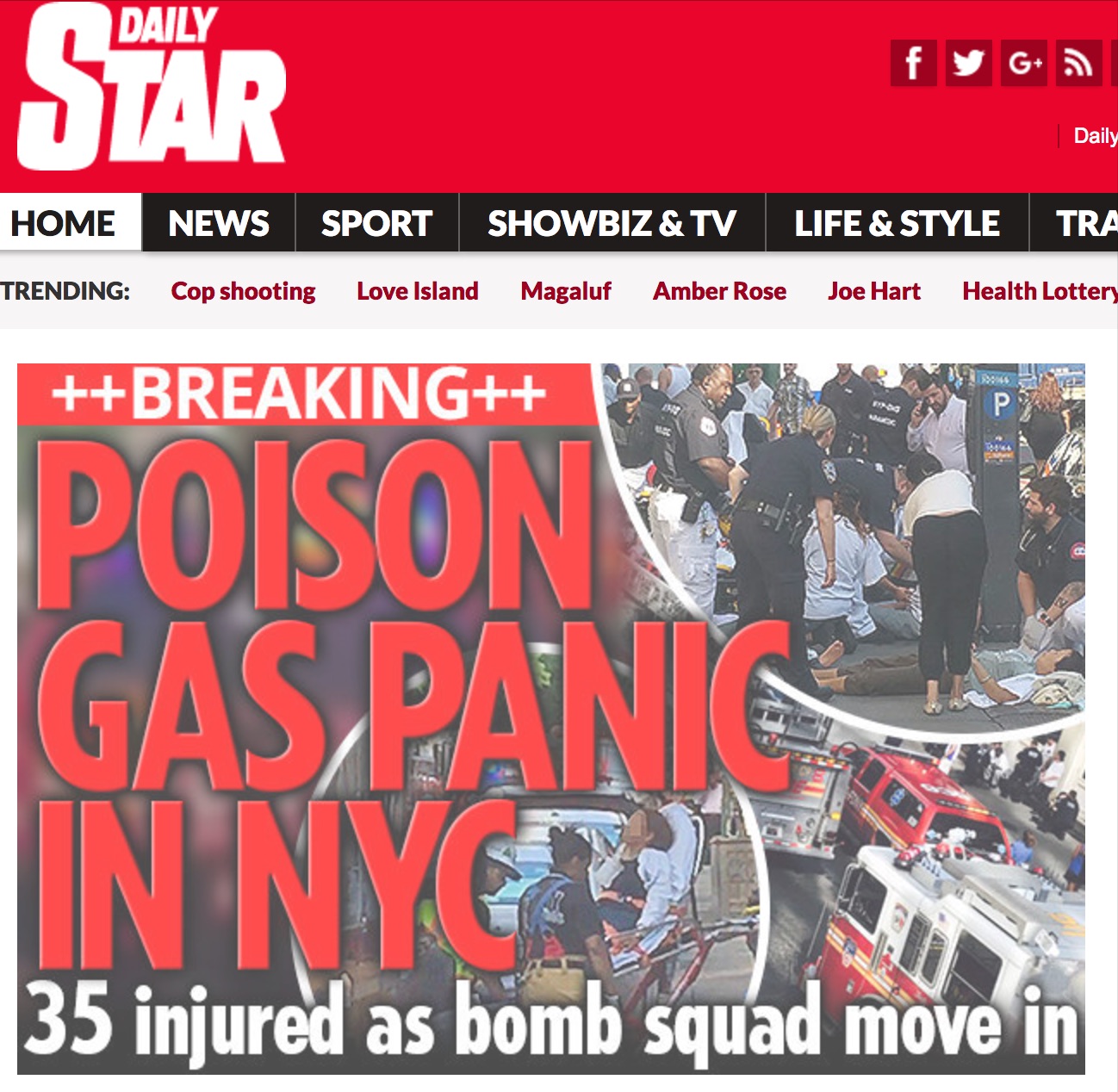 【新唐人亞太台 2017 年 06 月 13 日訊】美國紐約市西百老匯街頭驚傳爆炸,傳出有35人因此受傷,警方已包圍西百老匯與莫瑞街附近。據英媒Daily Star《每日星報》引述消息來源稱,一棟大樓的地下室還有一枚可疑包裹,正釋出一氧化碳氣體。