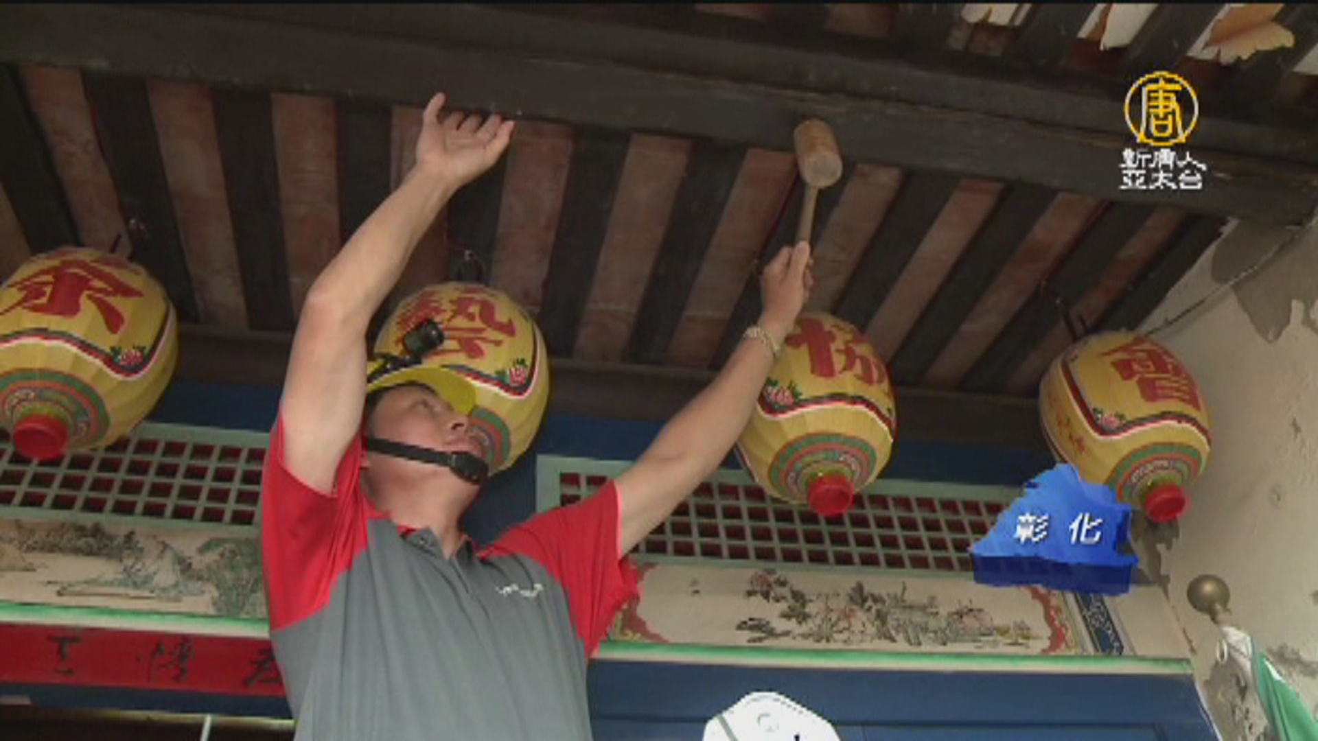 技術人員爬上屋頂敲敲木頭樑柱,檢測木質的狀態,鹿港木造古蹟保存區,年久失修,蟲蟻是最大的危害,工作人員用白蟻餌劑,藉由白蟻間互相餵哺的方式,達到消滅白蟻巢穴,延長古蹟生命。