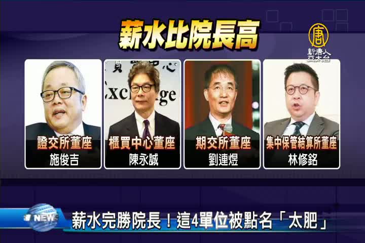 【新唐人亞太台 2017 年 06 月 26 日訊】證券期貨周邊4單位董事長和總經理年薪約590萬元,高於各院院長年薪440萬元,就連聯合信用卡處理中心以及金融聯合徵信中心等單位的董事長和總經理,年薪超過300萬,比部長級待遇的年薪260萬元還要高!引來立委批評,退休高官轉肥缺,應該修法訂製旋轉門條款,另外年薪計算還是要以績效為主!