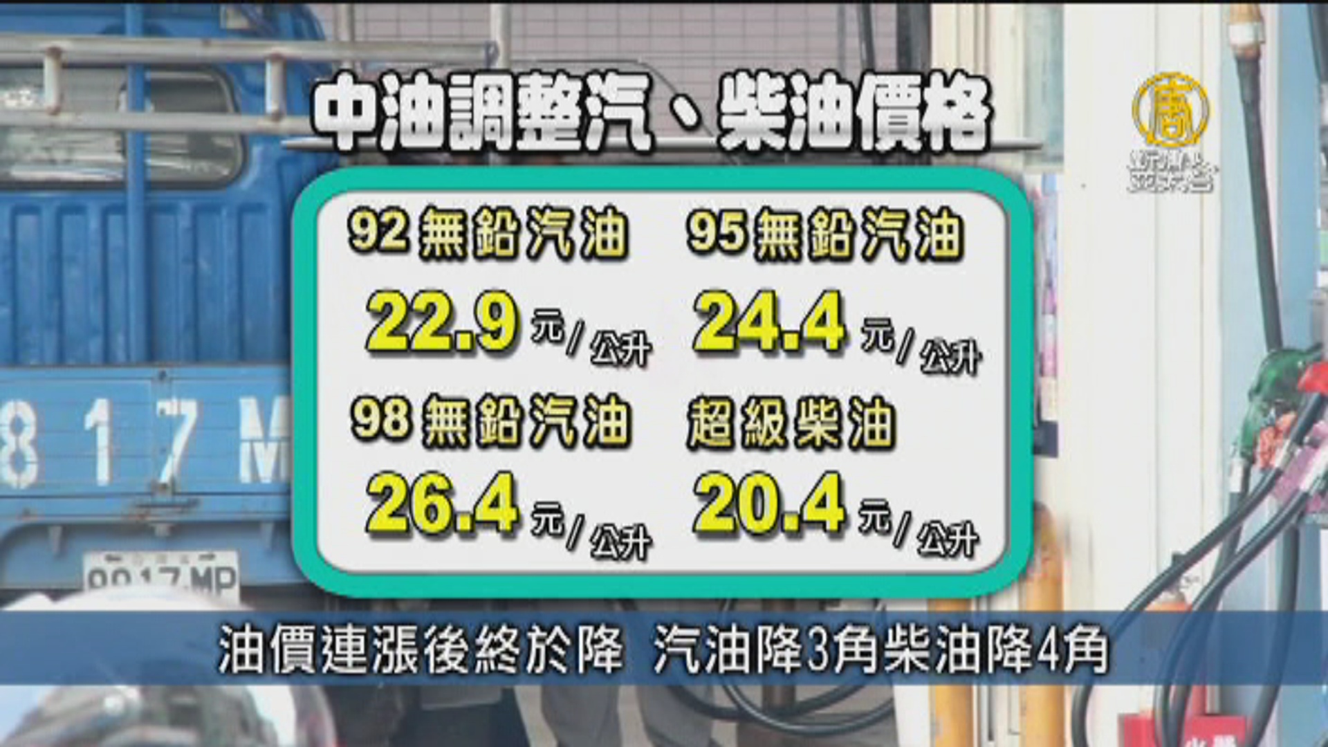 油價要降了!中油宣布,週一(17日)凌晨起,國內各式汽、柴油價格,每公升分別調降 0.3 和 0.4元。調整後,92無鉛汽油 22.9元、95無鉛汽油 24.4元、98無鉛汽油 26.4元、超級柴油 20.4元。