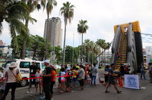 4層樓高的巨無霸滑水道,造價超過2百萬台幣,在中正運動場令小朋友尖叫連連,小朋友興奮的爬上四層樓高的氣墊梯,再一鼓作氣的往下滑,飛快的速度,夾雜著歡呼聲,刺激又有趣,讓現場洋溢著熱鬧與歡樂;尤其現場人潮更是擠爆現場,每項遊戲氣墊前,到處是小朋友排隊等待遊戲,以及在氣墊上快樂的遊戲畫面。