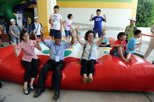 「何爺爺」何茂成與「何奶奶」郭嘉喬說,此次是「何爺爺跳跳屋」舉辦最盛大的一次,所有最大、最好玩的遊戲氣墊都到場;兩人說,雖然常在活動後累到不行,但看到學童玩得開心、笑得開懷,就覺得自己有責任要再振起精神,覺得開心又值得,會一直將歡樂繼續帶給孩子。