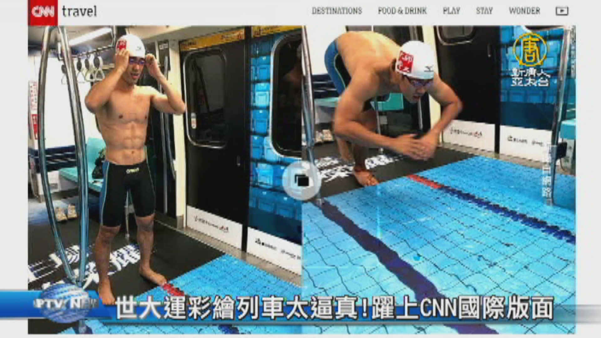 【新唐人亞太台 2017 年 07 月 28 日訊】「2017 台北世大運」即將在下個月舉行,台北市政府為了行銷世大運,將台北捷運松山新店線的車廂,打造為六大賽事的運動場地,超級逼真的3D場景,就像置身在運動場上,不僅吸引民眾拍照打卡,現在就連連美國媒體《CNN》也遠道而來採訪,一舉讓世大運列車登上國際版面。美國CNN指出,台北世大運列車中的泳池主題最受歡迎,這也是台灣境內到目前為止最大規模的運動賽事。