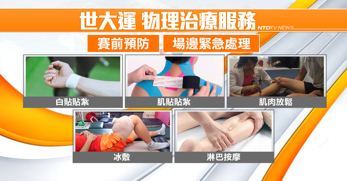 【新唐人亞太台 2017 年 07 月 29 日訊】新聞鏡頭,轉回台灣,世大運打造奧運級物理治療團隊,由領有證照的物理治療師,提供一千人次的,醫療防護服務。在比賽期間,執行運動員賽前預防傷害、場邊緊急處理。