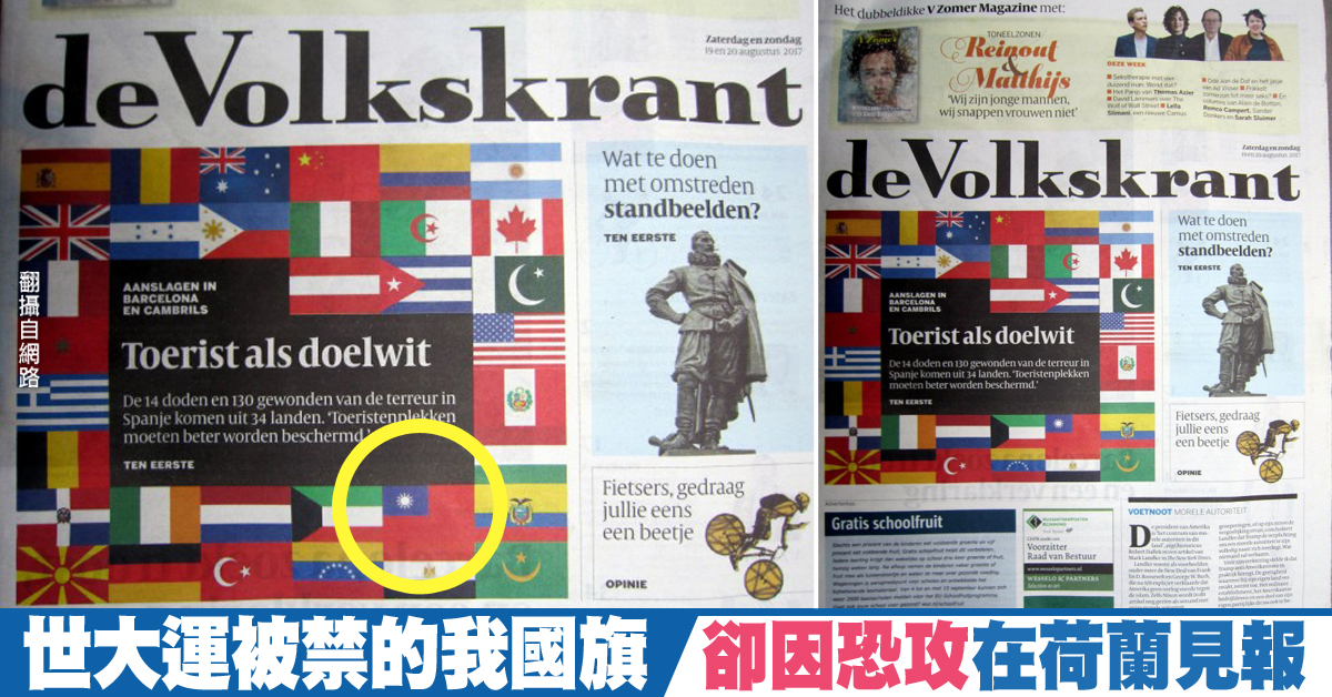 【新唐人亞太台 2017 年 08 月 22 日訊】西班牙巴塞隆納17日發生恐攻事件,造成13死、超過120人受傷,其中也包括台灣人受害。荷蘭一家主流報紙《人民報》日前以頭版新聞報導,並以國旗代表受害者來自的國家,共有34國,中華民國國旗也在其中。對比這次在台灣舉辦的世大運,所引起的國旗爭議,讓旅居荷蘭的台灣民眾直說「感觸良多」。