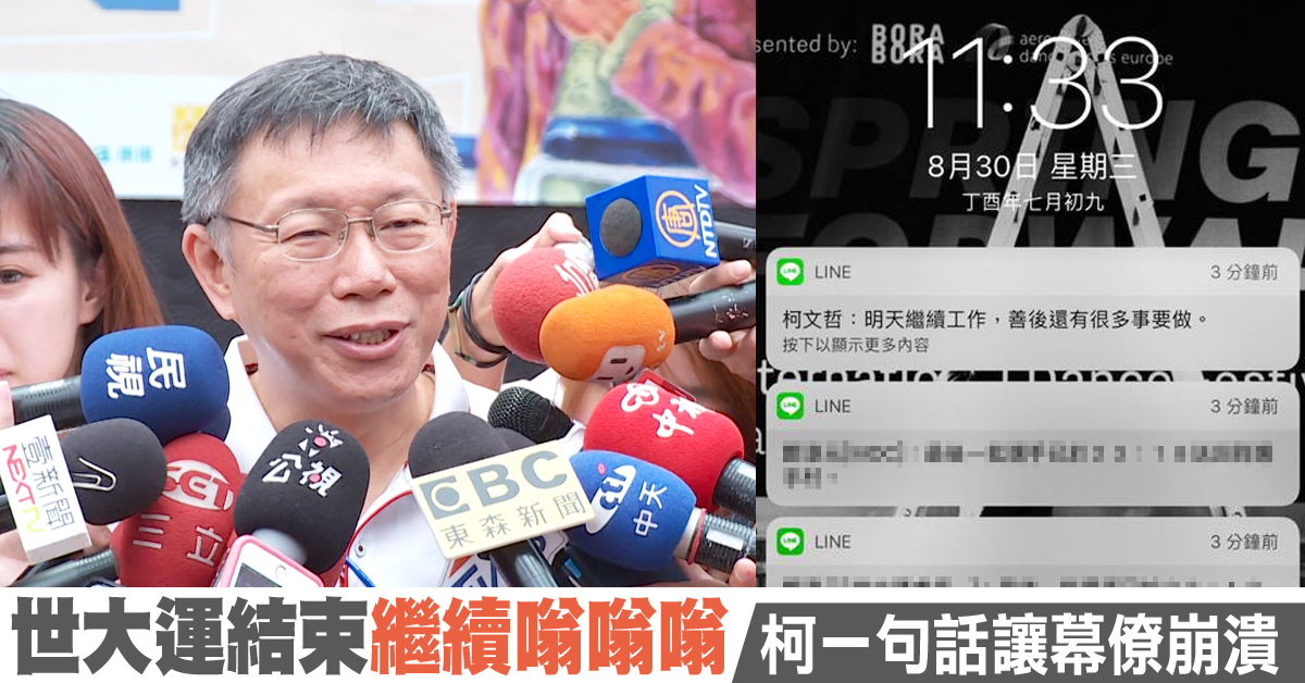 2017台北世大運順利落幕,台北市長柯文哲在閉幕式結束後,傳了訊息給幕僚,寫道「明天繼續工作,善後還有很多事要做」,讓他們相當崩潰,世大運發言人楊景棠還在臉書哀嚎,並寫說「原本想打感謝文的...一個瞬間,整個熄滅...」;柯文哲今天被問到這件事,他回:「我沒放假你放什麼假!」一句話電爆下屬。