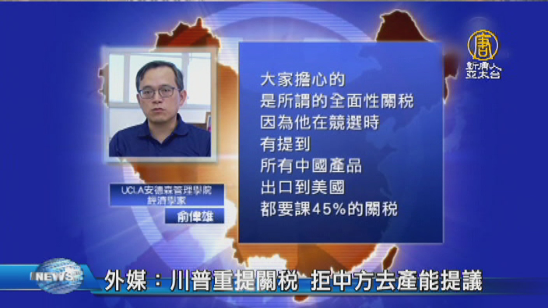 UCLA安德森管理學院經濟學家 俞偉雄:「大家擔心的是所謂全面性關稅,因為他在競選時有提到,所有中國產品出口到美國都要課45%的關稅,那個就是很大條的事情。那樣可能貿易戰爭就會起來。可是我覺得不會,(川普)他會做的就是說,鋼鐵你有傾銷,你有政府的補貼,他就針對個別產品來給你施加反傾銷稅。我覺得中國到時侯可能還是要理解到,你今天是靠美國這個市場的話,你要看長期的永續的經濟發展的話,減少貿易赤字、雙方貿易不平衡的現象,是對中國對美國都好的事情。」