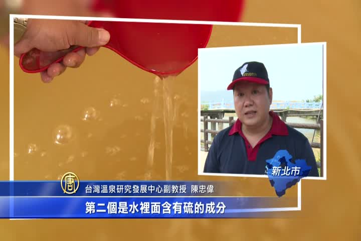 【新唐人亞太台 2017 年 09 月 21 日訊】新北市金山區公所進行溫泉井改善工程,沒想到挖到黃褐色的溫泉,居民以為挖到黃泥水,等找溫泉專家鑑定之後,才確認泉水富含鐵質及鹽分,是相當罕見的「氯化物硫酸鹽泉」。目前全台灣只有花蓮瑞穗有,而在日本兵庫縣的有馬溫泉,也是相同泉質,在當地被稱為黃金湯。
