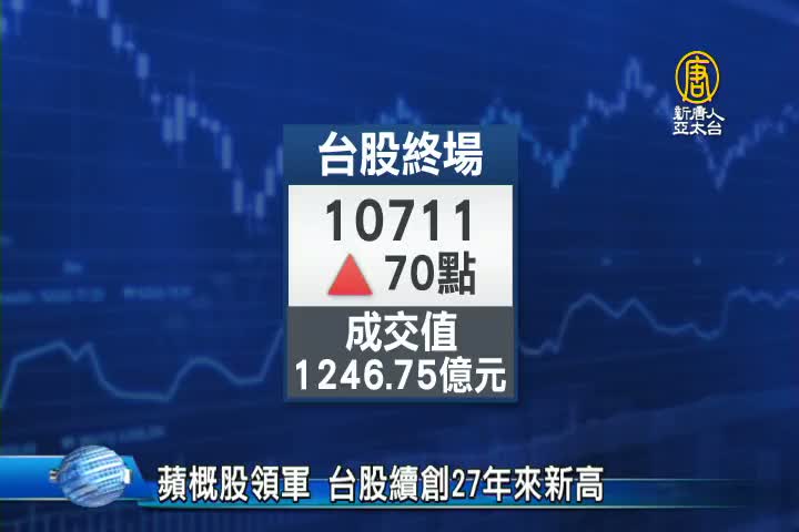 【新唐人亞太台 2017 年 10 月 12 日訊】美國聯準會昨天公布最新會議紀錄,顯示12月升息機率偏低,連帶使美元指數下降,美股3大指數再創新高。而在台股表現, 今天在權王台積電、股王大立光、蘋概股指標鴻海領軍上攻帶動下,開高走高 終場上漲70點,收在10711點,不但成功站穩萬點100天,續創27年來新高。 另外,今天外資持續匯入,台灣依舊是股匯雙漲,新台幣終場以30.213元兌1美元作收,升值1.9分,匯價連兩升,並續創半個月新高。