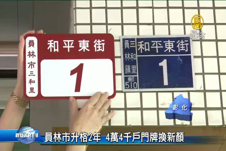 【新唐人亞太台 2017 年 10 月 12 日訊】彰化縣的員林鎮升格為員林市已經滿兩年,舊有的門牌與改制後的轄區名稱不符,為了方便民眾辨識門牌地址,住家門牌也跟著換新,這次約有4萬4千個門牌工期大約在2018年9月底全面換發新式門牌。