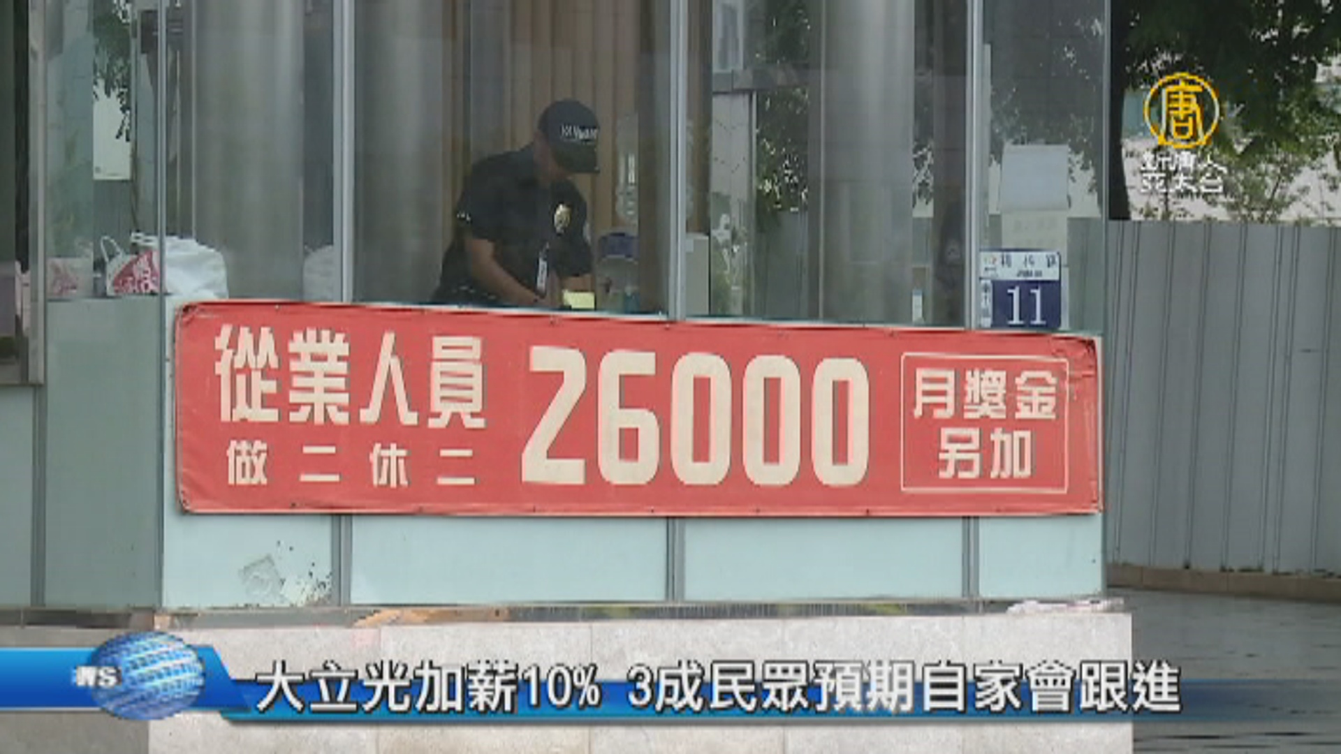 【新唐人亞太台 2017 年 10 月 20 日訊】財經消息再來看到,大立光今天宣布,為擴大人員招募並鼓勵員工留任,公司將依營運現況,即日起將加發作業人員月獎金及久任獎金,之後薪資將提高超過10%。對此,國發會副主委邱俊榮表示樂觀其成,希望加薪這件事在市場上形成一個良性的競爭。不過,國泰金控今天公布調查指出,只有 30% 的民眾認為自己任職的公司,會跟進軍公教加薪,調薪的預期值為 1.4%。