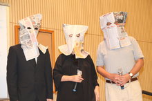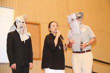 【新唐人亞太台 2017 年 10 月 21 日訊】在日本創下13億日幣票房的驚悚推理電影「預告犯」,10月21日下午在嘉義縣表演藝術中心放映,嘉義縣長張花冠和影想文化藝術基金會創辦人李崗導演21日上午以電影中「報紙男」造型出席開幕餐會,張李兩人用報紙頭套「張冠李戴」,噱頭十足,為這場電影沙龍增添不少話題。