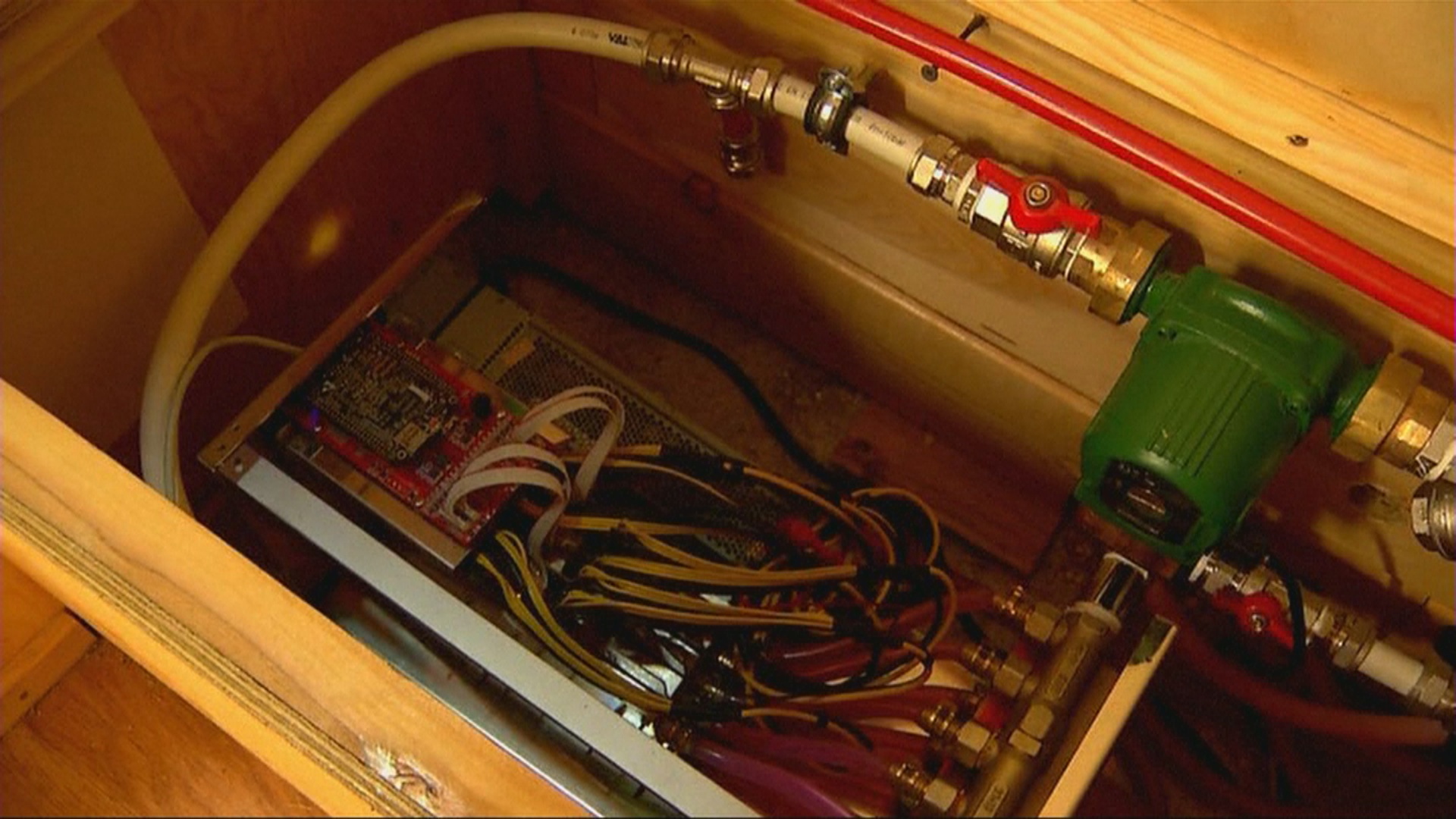 「處理器位於此處,所產生的熱由液體傳熱器累積再分散到地板加熱系統中。」