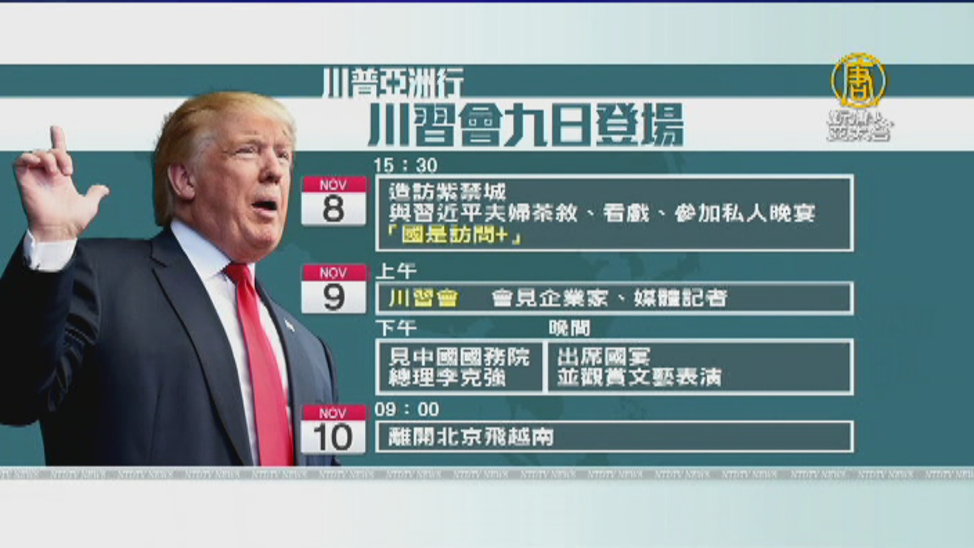【新唐人亞太台 2017 年 11 月 08 日訊】好,來看到畫面,除了總統與隨行幕僚外,隨川普一同抵中的還有美國商務部部長羅斯帶領的一個涵蓋能源、通信、金融等領域的豪華商貿代表團。這次訪問是川普就任美國總統以來,第一次對中國的國是訪問,同時也是中共十九大後,接待的第一起國是訪問。川普在機場沒有發表談話,而是馬上前往北京故宮博物院,與中國國家主席習近平茶敘。根據規畫,川普夫婦下午3點半,造訪紫禁城,與習近平夫婦茶敘、看戲,並參加私人晚宴。這是中方安排「國是訪問+」的一環,川普與習近平將進行小範圍、非正式互動,溝通朝鮮半島核問題等「共同關心的重大問題」。明天上午,將在北京人民大會堂,出席歡迎儀式,與習近平舉行「川習會」,隨後共同會見企業家、媒體記者。下午將會見中國國務院總理李克強,晚間出席國宴並觀賞藝文表演。川普預定在後天上午9點離開北京,飛往越南,參加亞太經濟合作會議(APEC)年會。