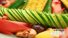 食材:美生菜絲、洋蔥絲、玉米、小黃瓜、蘆筍、熟蟳棒肉、蕃茄、柳橙、葡萄、柴魚片、白芝麻、柳橙汁、檸檬汁少許。