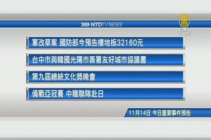 【新唐人亞太台 2017 年 11 月 14 日訊】接著看到,今天, 11月14日,星期二 ,有哪些重要活動。首先是,軍改草案,國防部今將預告樓地板為三萬兩千一百六十元。接著看到,今天台中市將和韓國光陽市,簽署友好城市協議書。另外,第九屆總統文化獎晚會,今天舉行。最後是體育消息,備戰亞冠賽,中職聯隊,今天將赴日本。
