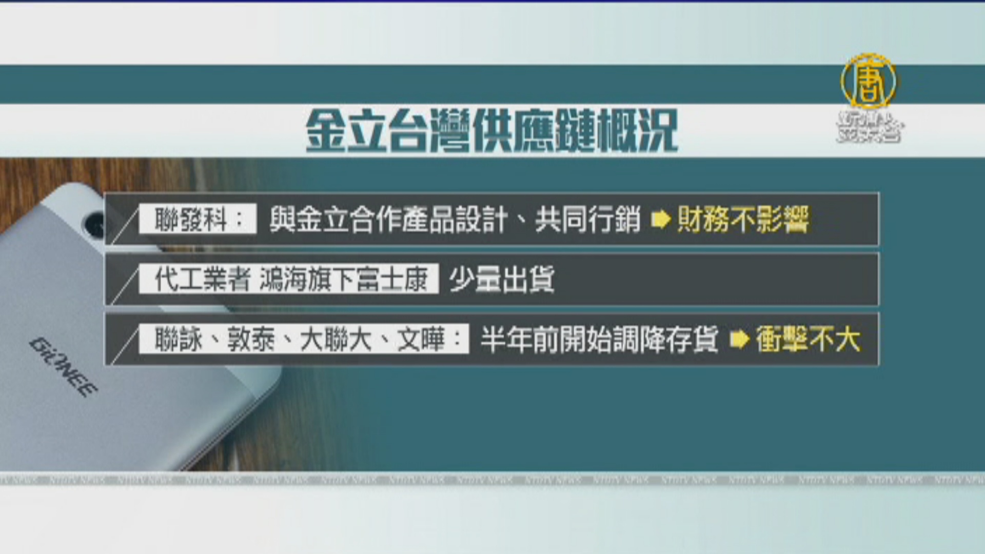金立國內供應鏈業者聯發科,不少產品共同行銷,不過因為以現金交貨,對財務並不影響;此外,鴻海旗下富士康印度廠,也少量代工金立手機,但出貨有限;至於IC設計業者聯詠、敦泰、大聯大、文曄等廠商,半年前,開始調降存貨,衝擊並不大。