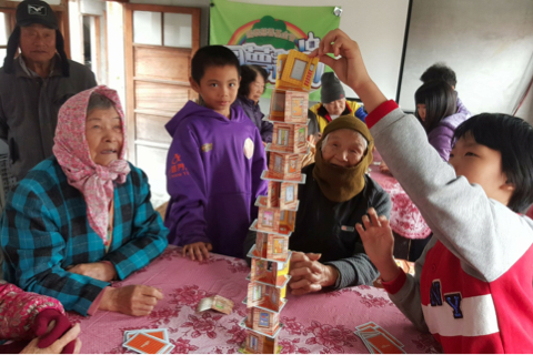 國小生利用簡單物品與社區長者一起桌遊(嘉義縣和興國小提供)