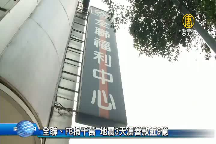 【新唐人亞太台 2018 年 02 月 09 日訊】花蓮強震,讓許多災民無家可歸,重建急待資源,企業善款持續湧入,今天,全聯慶祥基金會宣布捐助1000萬元,並提供自有戶每戶2萬元、承租戶每戶1萬元的急難救助金申請。另外臉書也宣布捐款一千萬,這是臉書首次在台灣捐款。地震第三天,外界已經湧入善款超過8億台幣,其中鴻海集團與郭台銘,共捐款1.2億。