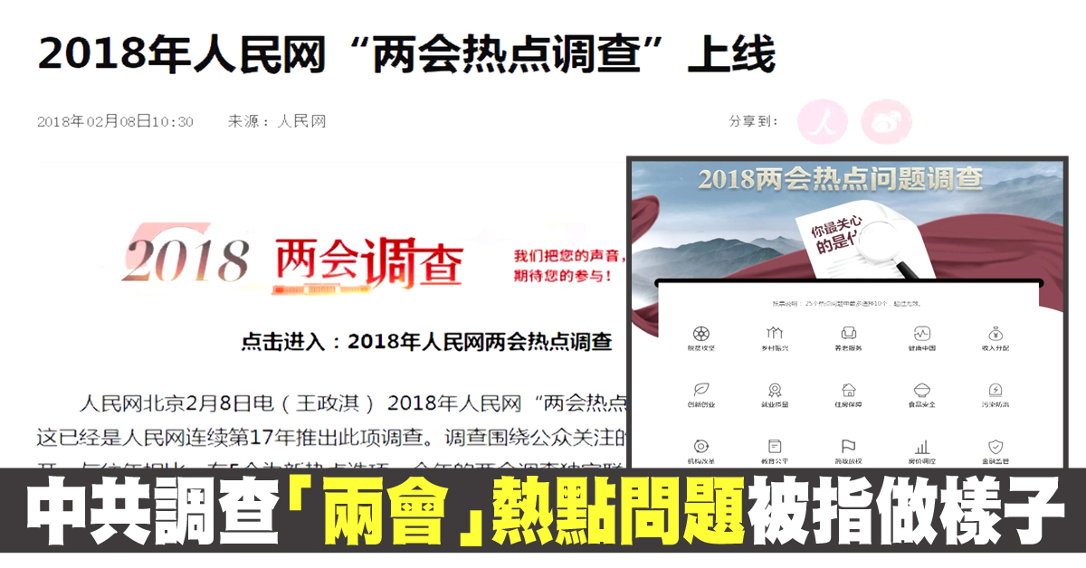 2月13號,中共黨媒「新華網」微博曬出「2018兩會熱點問題調查」相關資訊,並列出包括收入分配、食品安全、金融管理、教育公平等25個問題,邀請中國億萬網民從中選擇10個問題點擊投票。