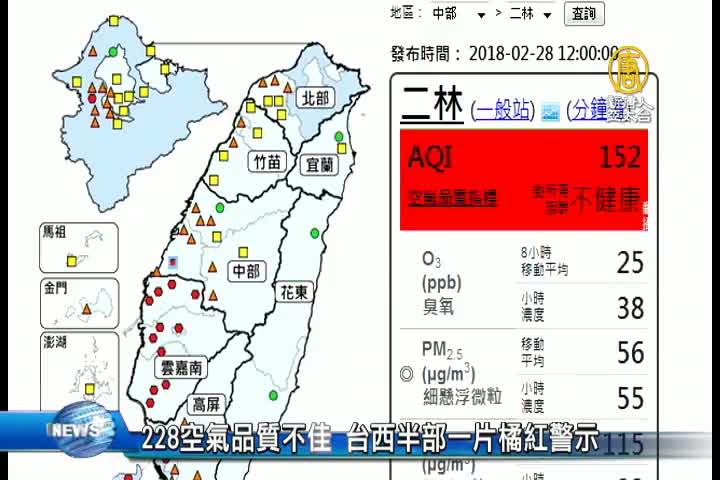 【新唐人亞太台 2018 年 02 月 28 日訊】午報頭條帶您關心,今天是二二八和平紀念日假期,不過觀眾朋友出門可要注意了,根據環保署網站顯示,今天台灣西半部地區空氣品質普遍不佳,超過40個測站空氣品質拉警報,尤其中南部地區有22個測站,達到對所有族群不健康的「紅色警示」等級,台電也已經安排台中、協和及興達預擬自主降載減排。