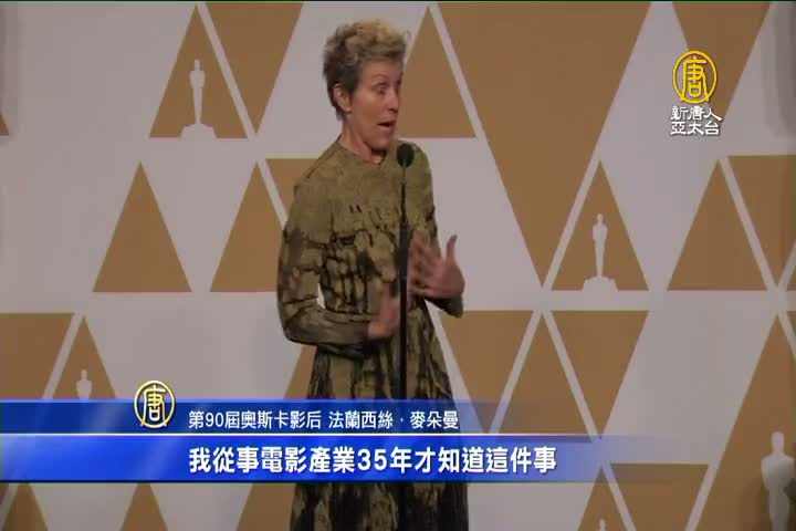 【新唐人亞太台 2018 年 03 月 07 日訊】以《意外》拿下第90屆奧斯卡最佳女主角的美國女星法蘭西絲.麥朵曼,致詞時送出的兩個字:inclusion rider,意外引發網路熱搜。麥朵曼呼籲,一線明星簽約時,可以用附加條款提出要求,保證電影的多元化,真正反映現實。