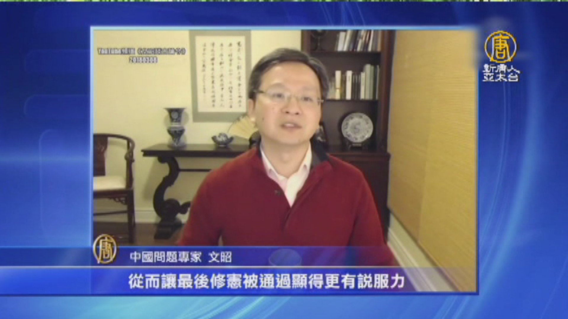 時政分析人士 文昭:「我相信最後會有多少反對票也是事先安排好的,就說它有一定比例的反對票出現,會顯得投票的過程更加真實,從而讓最後修憲被通過顯得更有說服力。」